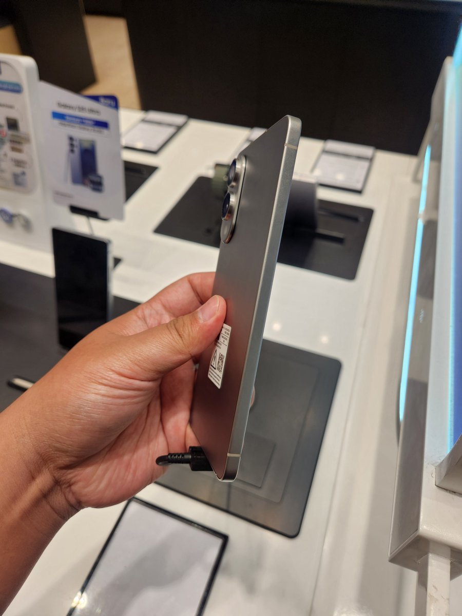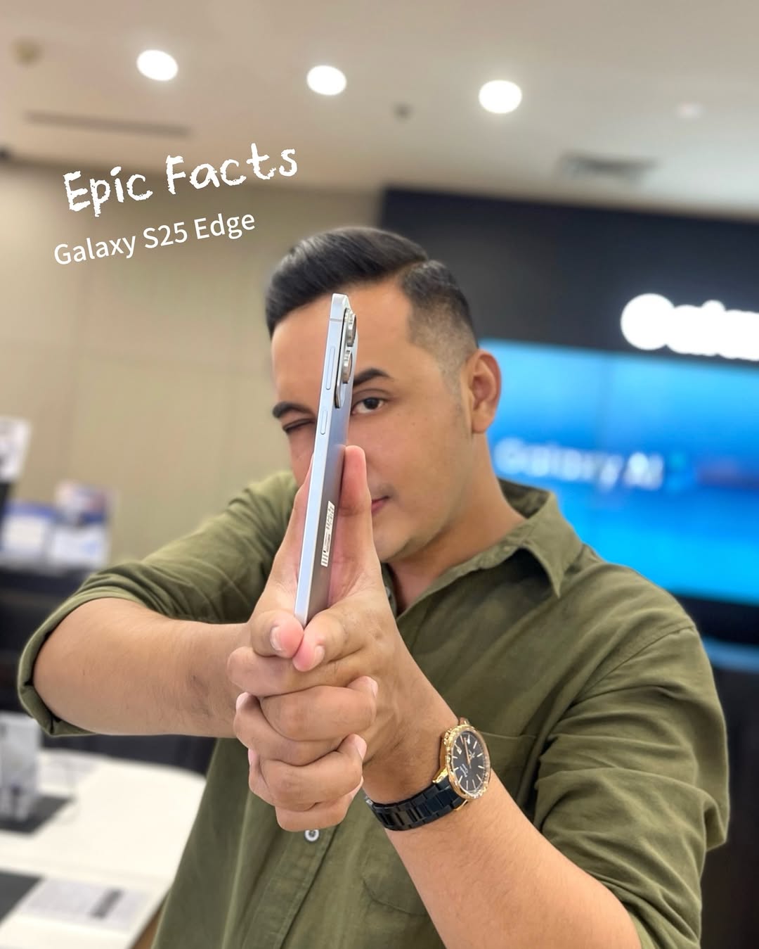 1. Pegang Galaxy S25 Edge dan ambil foto dengan pose sekreatif mungkin yang bisa menonjolkan betapa tipis dan sleek-nya desain Galaxy S25 Edge.